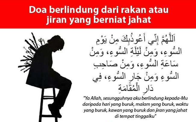 “Ya Allah sesungguhnya aku berlindung kepada-Mu dari hari yang buruk, malam yang buruk, waktu yang buruk, teman yang ja hat dan tetangga yang jahat di tempat tinggal tetapku.” (HR. At-Thabrani).