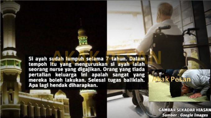 Si ayah sudah lmpuh selama 7 tahun. Dalam tempoh itu yang menguruskan si ayah ialah seorang nurse yang digajikan. Orang yang tiada pertalian keluarga ini apalah sangat yang mereka boleh lakukan. Selesai tugas baliklah. Apa lagi hendak diharapkan.
