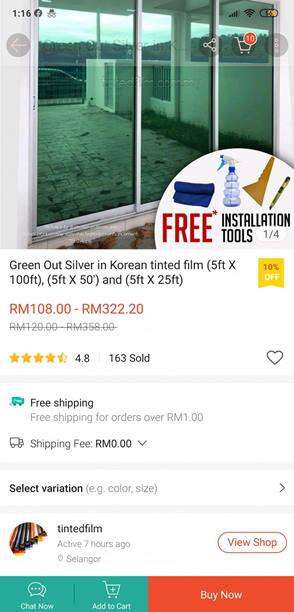 Sticker tinted 5ft x 50ft – RM210 – boleh beli di Shopee. Siap dapat kit pemasangan. Jimat lebih kurang RM800.