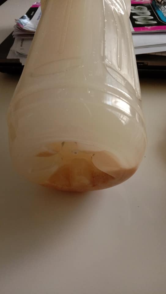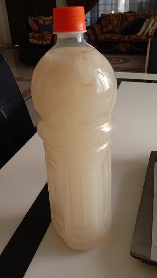 Ini ialah air basuhan beras yang telah diperam semalaman. Selepas tempoh itu, masukkan dua keping roti kosong. Brand apa pun boleh. Carik-carikkan sebelum masukkan ke dalam botol ini. Letakkan di bawah sinki untuk tempoh seminggu. Longgarkn sedikit penutupnya. Jangan ketat sangat.