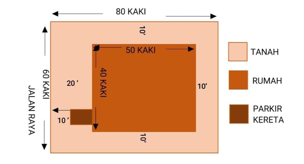 Jika lebar tanah 60 kaki, anjakan 10 kaki di kiri dan kanan, maka lebar rumah yang boleh dibina adalah 40 kaki. Dan jika panjang tanah 80 kaki pula, anjakan 20 kaki di depan dan 10 kaki di belakang, maka baki panjang rumah adalah 50 kaki.