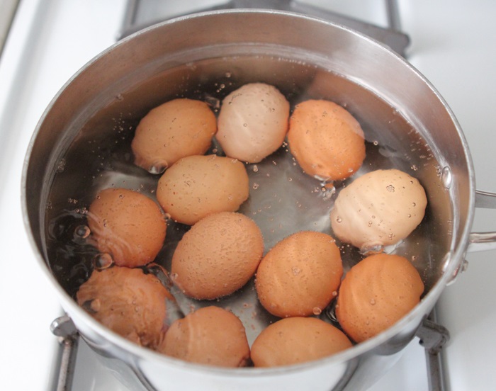 Mula-mula, rebuskan air dalam periuk. Pastikan kuantiti air mencukupi sampai dapat menutupi keseluruhan telur yang kita akan bubuh kejap lagi.