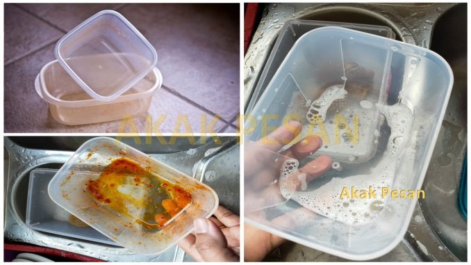 Bekas makanan plastik yang ada kesan minyak sambal terutamanya memanglah susah nak hilang.